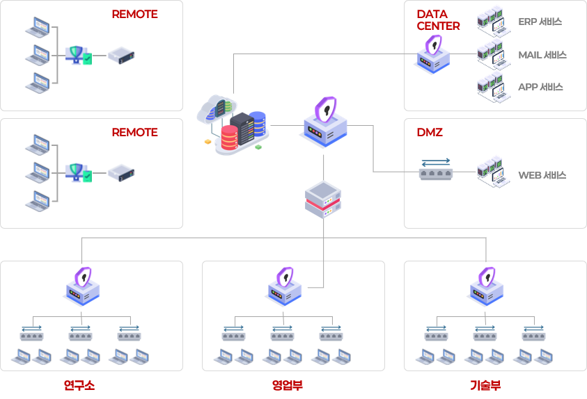 고객사 네트워크의 Gateway 및 세그먼트 구간별 악의적인 공격 및 침해 전파에 대한 차단을 위하여 Layer2~3, 사용자 및 Application 기반의 보안 기능을 제공하여